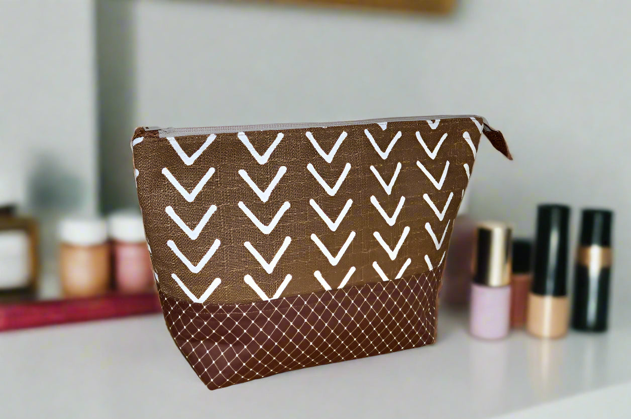 Mocha Wafer Cosmetic Bag – Two-Tone Canvas with Newspaper Print Lining