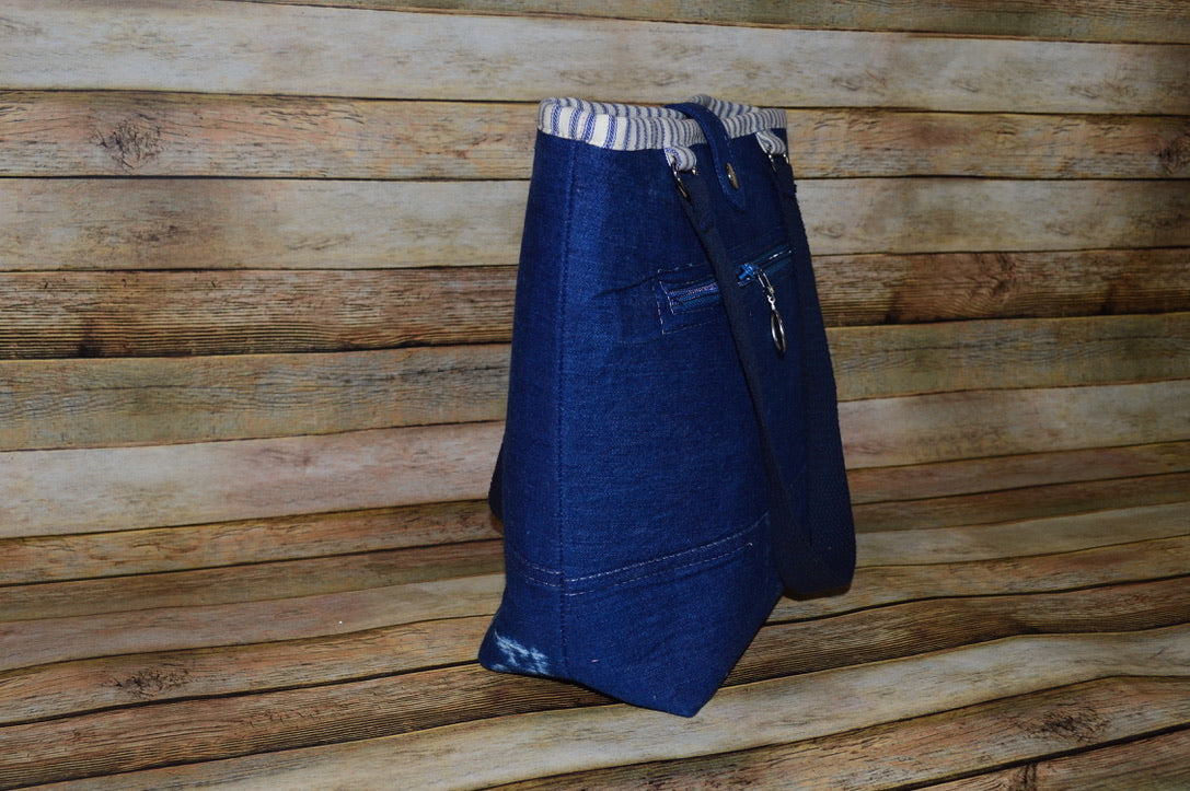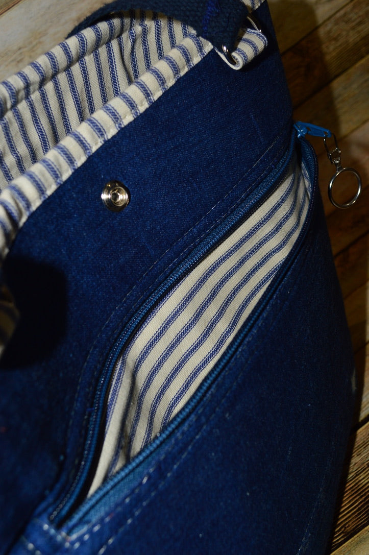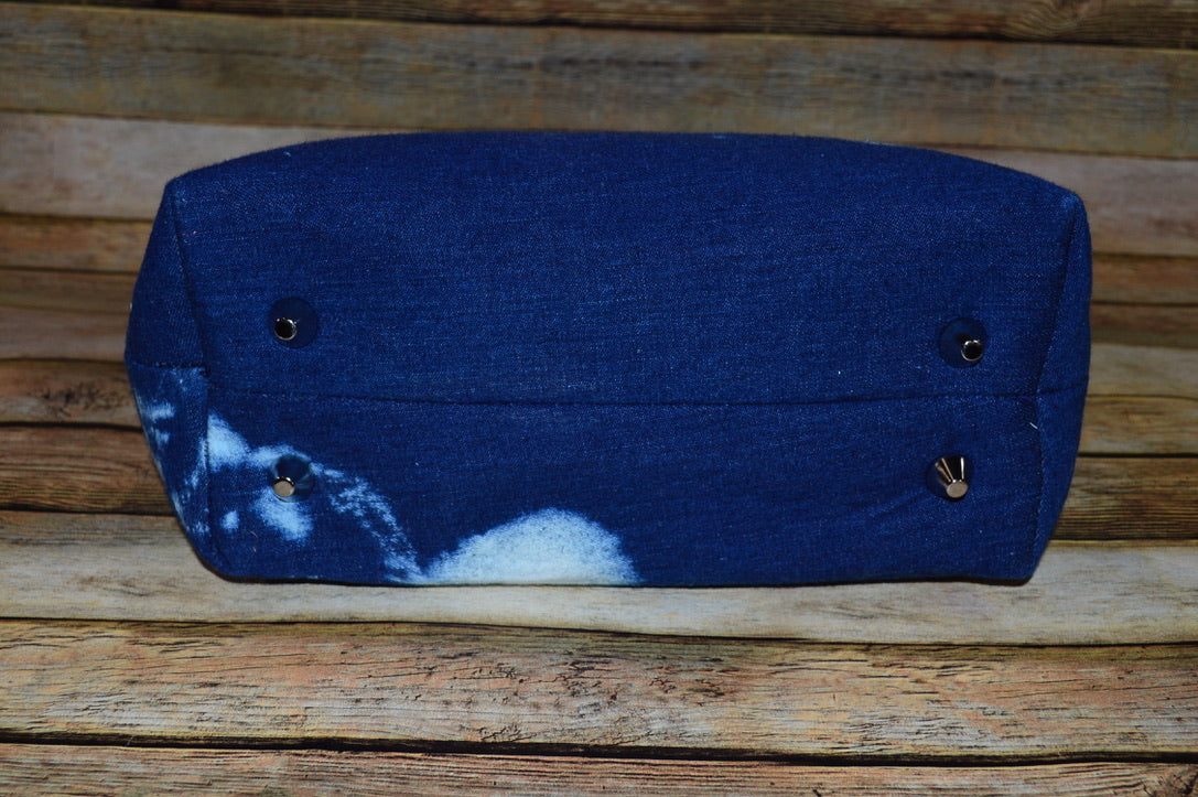 The Scooby Blue is a bold, denim statement bag with a soft utilitarian edge. Crafted from dark blue denim with unique faded splotches and finished with crisp white top stitching, it blends classic fabric with fresh personality. A front zippered pocket and structured design make this bag as functional as it is stylish.