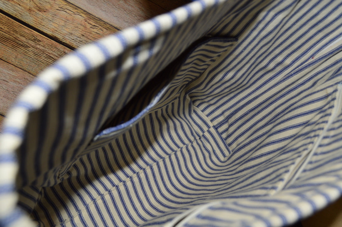 - Lined with navy & white ticking stripe cotton